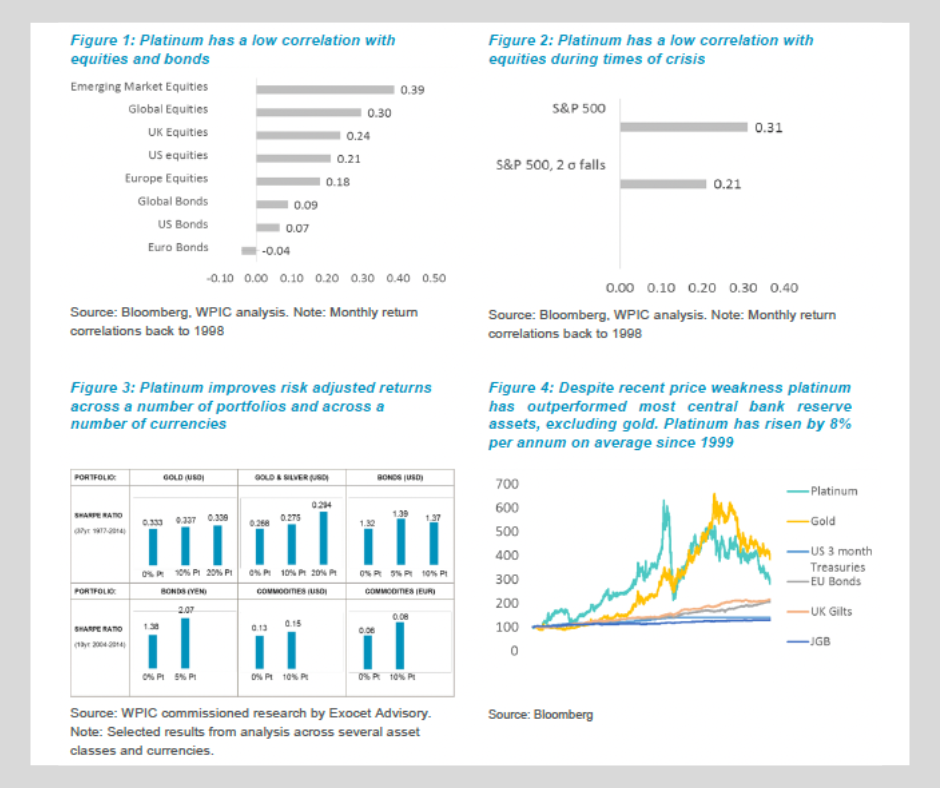Platinum has a low correlation with equities and bonds (see Figure 1).
