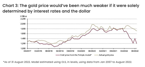 Based solely on interest rates and dollar strength, gold should have fallen about 30%, according to a WGC model.