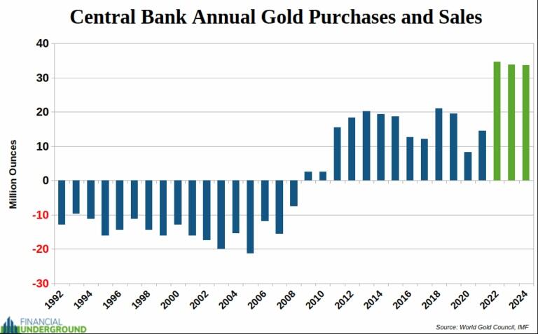 Last year, central banks purchased approximately 34 million ounces of gold, marking the third consecutive year of near-record buying.