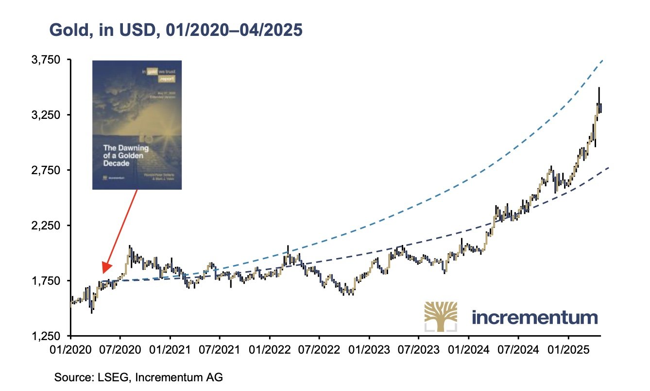 If you’re only interested in the future, then it’s good to see what previous forecasts have done. Here’s one from “In Gold We Trust” – they did two forecasts, a base case and and inflation one (the dotted lines). The actual price is between the two lines.