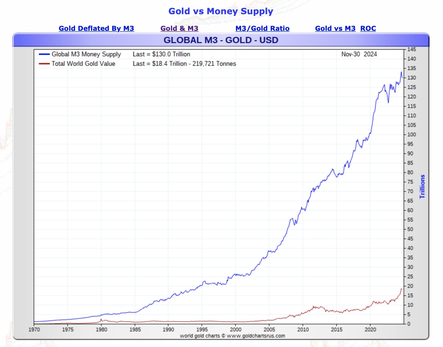 As you know, you can’t print gold, but you can print money. This graph compares the growth (in value terms) in M3 money supply (M3 is traditionally used by economists to estimate the entire money supply within an economy and by governments to direct policy and control inflation over medium and long-term periods.) with the value of gold in the market.