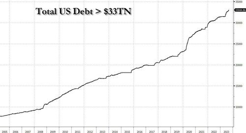 Today, theTreasury announcedthat for the first time, total US debt has surpassed $33 trillion, rising by $56 billion in one day,and by a mindblowing $1 trillion in justthe past 3 months!