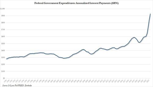 The historic breakout takes place just weeks before the interest on total Federal debt isset to hit $1 trillion, surpassing how much the US spends on defense – and soon after – every other outlay category.